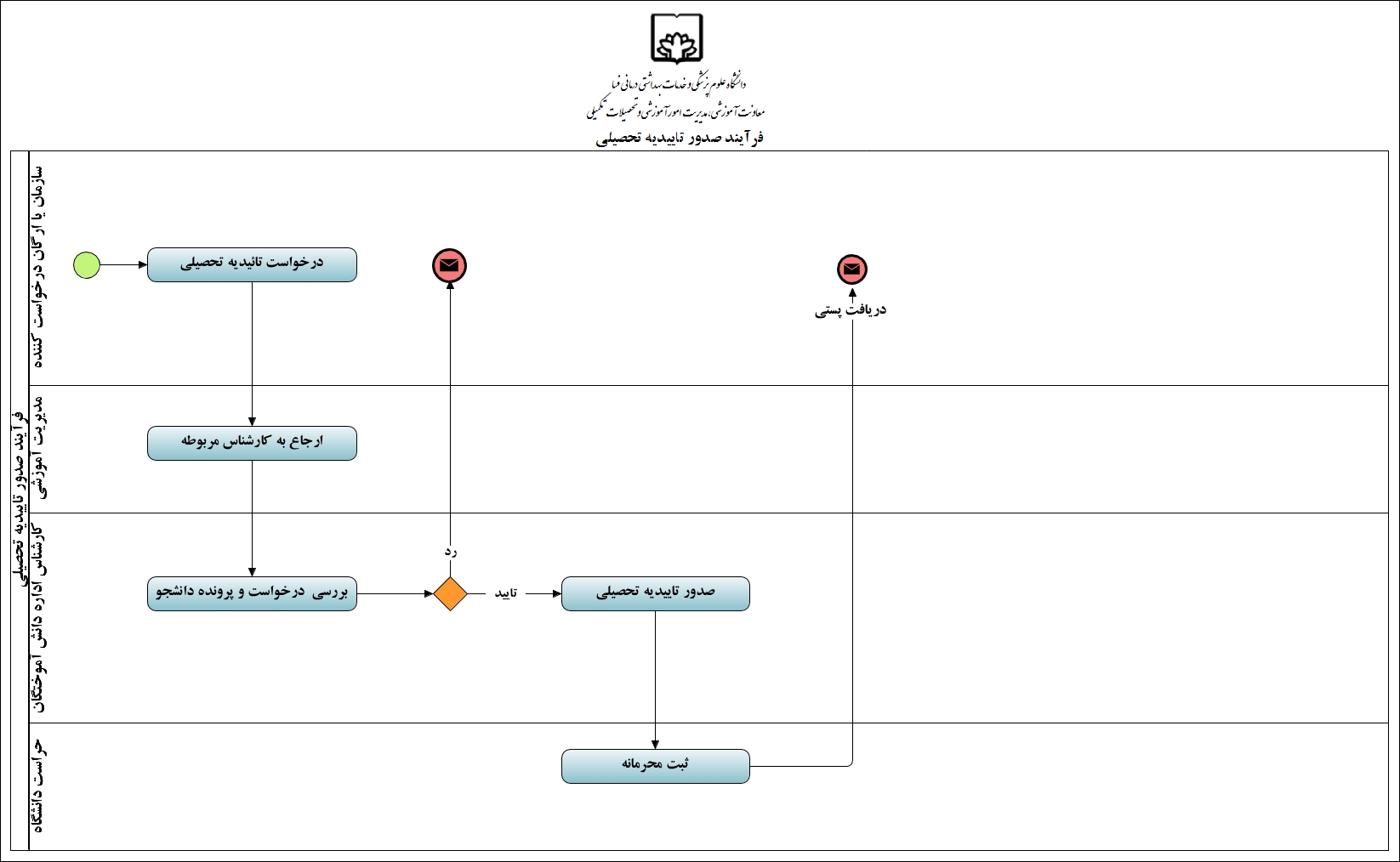 ضمناً خواهشمند است پس از دریافت مرسوله، پاکت حاوی مدارک تحصیلی را باز نموده و پس از تکمیل و امضاء رسید دریافت مدارک و قرار دادن آن در پاکت کوچک، جهت عودت به دانشگاه به مأمور محترم پست تحویل فرمایید. عودت این رسید به منظور انجام مکاتبات بعدی الزامی و بدون هزینه خواهد بود.